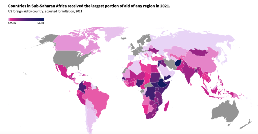 Estados Unidos proveyó más de 50 mil millones de dólares en ayuda internacional a cerca de 150 países y territorios, fondos regionales y ONG en 2021. Este mapa, construido a partir de información de la Agencia de los Estados Unidos para el Desarrollo Internacional (USAID) muestra qué países recibieron mayores fondos. La mayoría de la ayuda estuvo orientada a responder a crisis humanitarias y conflictos internos, siendo la asistencia alimentaria de emergencia la actividad que concentra mayores recursos. Afganistán emergió como el principal beneficiario, con 1,5 mil millones de ayuda. En el top 10, se encuentran varios países africanos (Etiopia, Sudán del Sur, la República Democrática del Congo, Nigeria y Sudán) que enfrentan hambrunas y conflictos internos. Colombia es de lejos el principal beneficiario de ayuda internacional norteamericana en América Latina y se ubica en la novena posición a nivel mundial, recibiendo millones de dólares para combatir el narcotráfico.